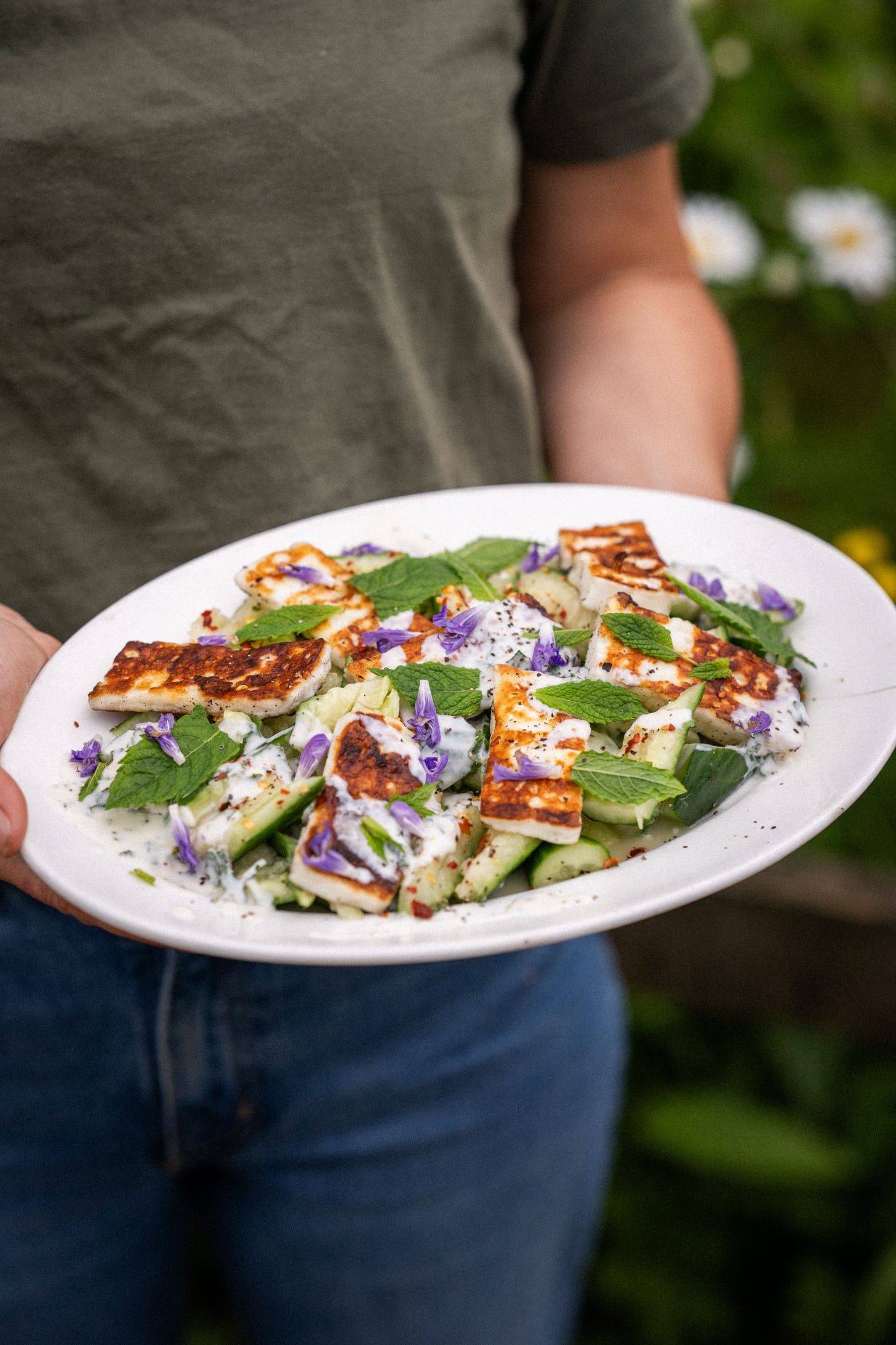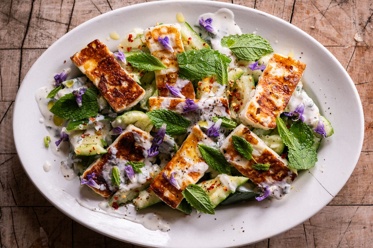 Smashed Cucumber Salad with Halloumi & Tahini Dressing